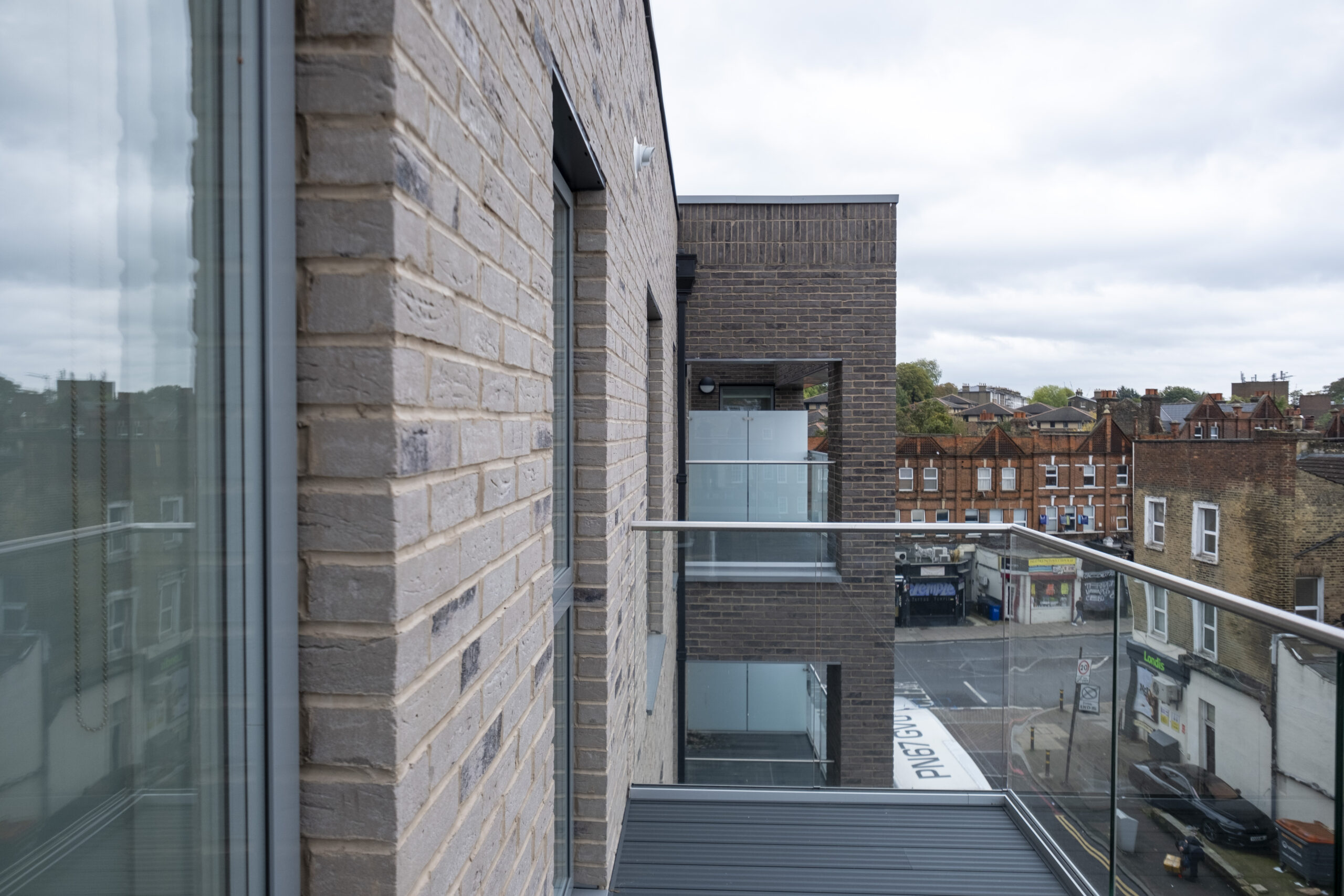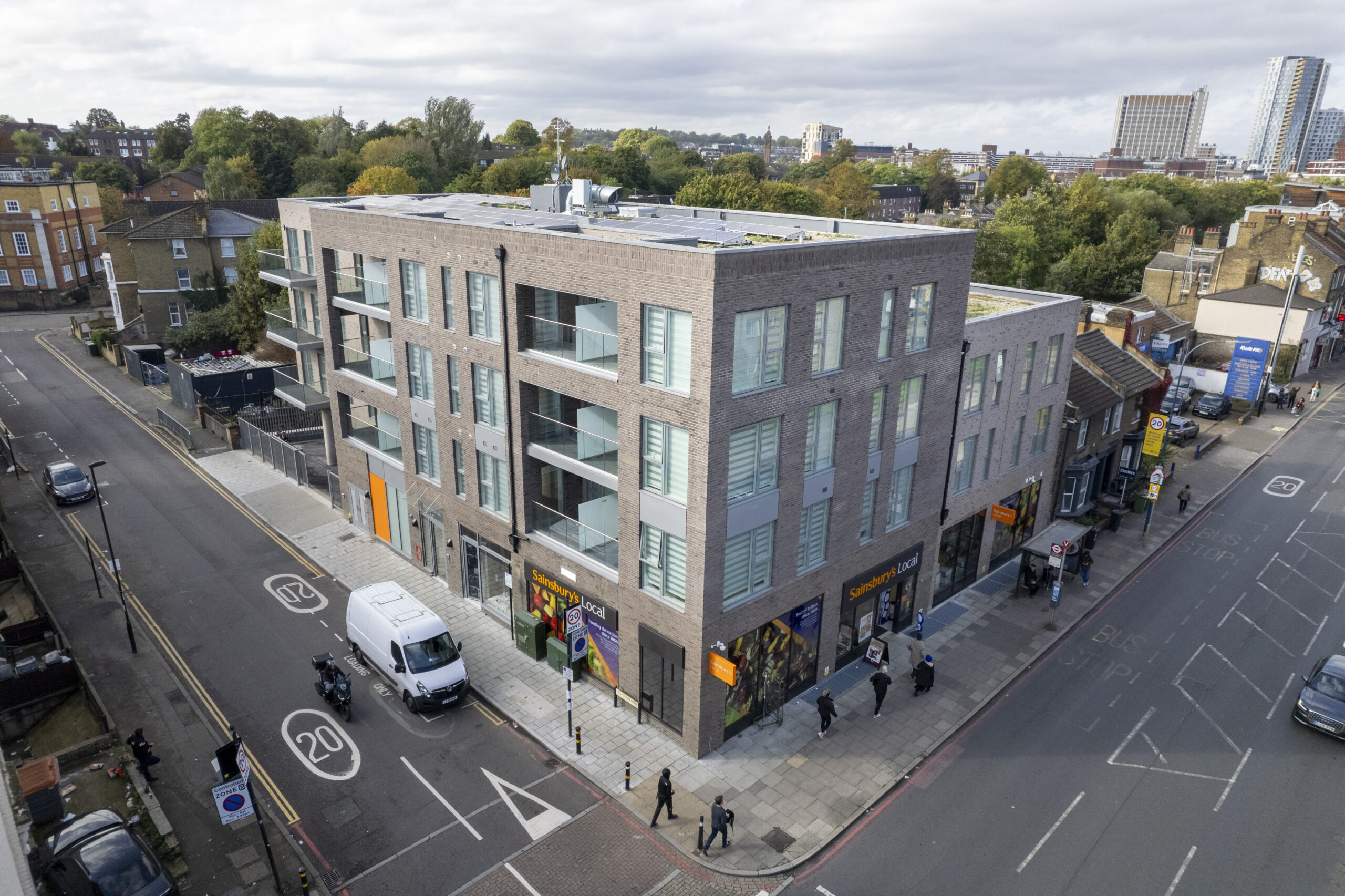 Situated in the heart of Lewisham, this mixed-use development replaces a former car showroom and workshop with a four-storey building comprising 17 residential units—a mix of one-, two-, and three-bedroom flats—and two commercial units at ground and basement levels.